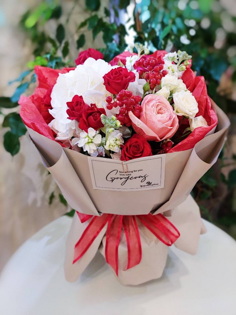 Букет из гортензии, матиолы, вибурнума и розы кустовой