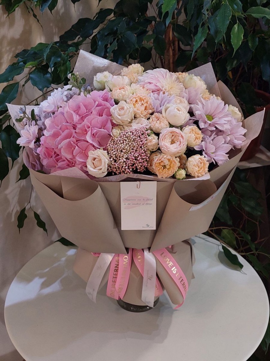 Букет из гортензии, роз, хризантем, твидии и озотамнуса
