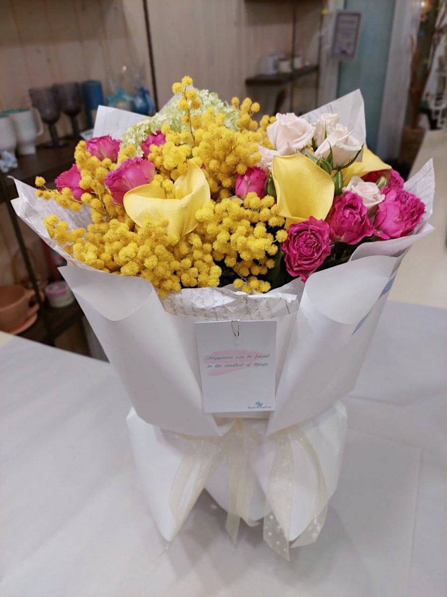 Букет из мимозы, калл и ароматных роз