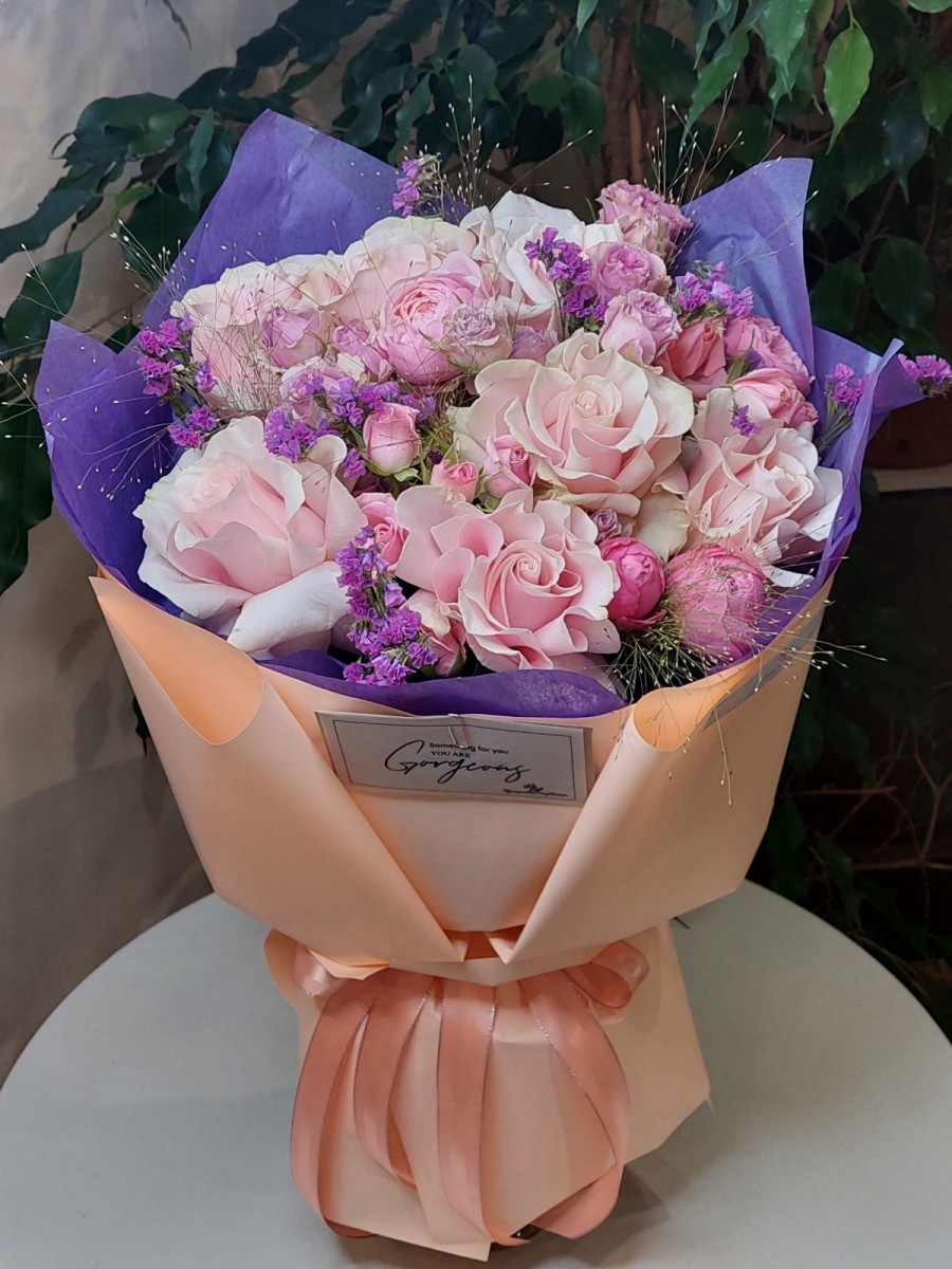 Букет с французской розой, пионовидной розой Сильва Пинк, кустовой розой, статицей и паникумом.