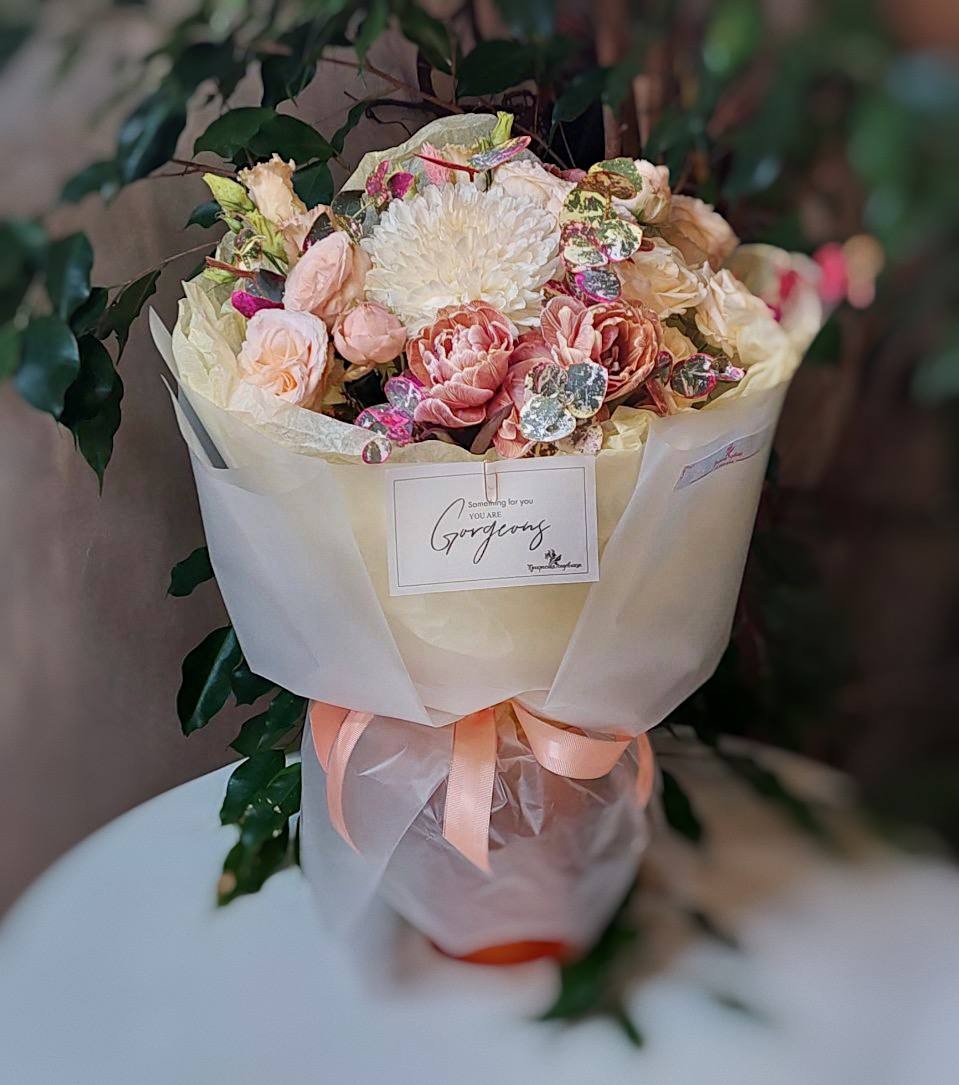 Букет с пионовидной розой, эвкалиптом, хризантемой, тюльпанами Брауни