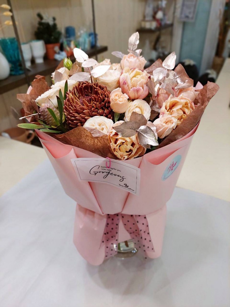 Букет с тюльпанами Брауни, розами Джентел Трендсеттер, хризантемами и леукодендроном