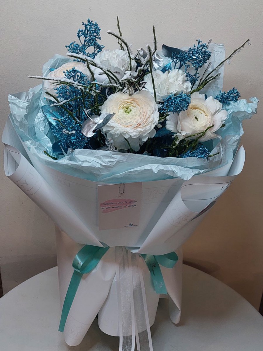 Букет с ранункулюсами, гвоздикой Блэк Пастель, скиммией, вакуиниумом