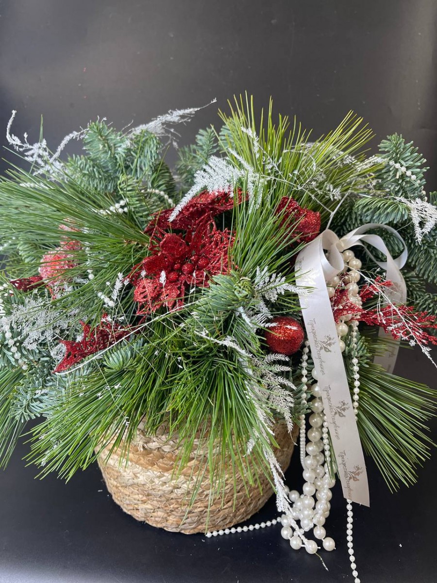 Композиция в корзине из веточек нобилиса и пинуса, белого аспарагуса и с праздничным декором