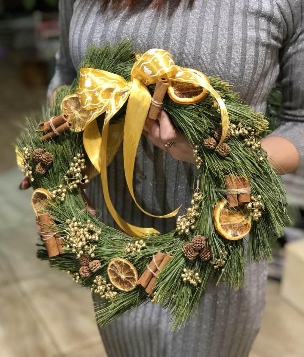 Рождественский веночек из пихты с дольками апельсина, корицы и шинуса